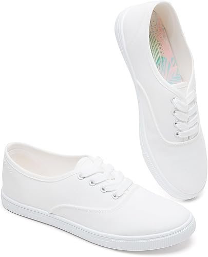Women’s classic low-top white canvas sneakers designed for everyday casual wear. Made with 100% breathable canvas fabric and a lightweight PVC sole, these shoes provide comfort and durability for spring, summer, and autumn seasons. Featuring soft lining with floral accents, lace-up closure, and memory foam cushioning for moderate support. Suitable for adults, ideal for walking, shopping, sports, and general lifestyle activities.