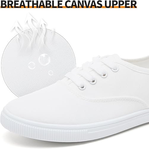 Women’s classic low-top white canvas sneakers designed for everyday casual wear. Made with 100% breathable canvas fabric and a lightweight PVC sole, these shoes provide comfort and durability for spring, summer, and autumn seasons. Featuring soft lining with floral accents, lace-up closure, and memory foam cushioning for moderate support. Suitable for adults, ideal for walking, shopping, sports, and general lifestyle activities.
